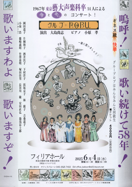 17年の時を超えて、「グループ・ロブ」が還ってきた!! 今年は昭和100年。 私たちは、戦後の昭和を駆け抜け、平成を生き抜き、 令和に傘寿を迎えました。 そんな歌仲間だからこそ、 今みなさんへ聴いてもらいたい歌があります。 皆さんへ伝えたい歌があります。 笑いあり、涙あり、 時にポ力もあり (??) 果ては何でもあり過ぎて、 "トイレに行かせてー!"客席のどこからか声が聞こえてきそうな 積載オーバー何のその、思い溢れる満載コンサート! 皆さん、覚悟してお聴き下さい。 でも、「歌時間」楽しく愉快にします! 私たちと陽気に「はしゃいで」楽しみましょう!! グループロブ一同 詳細は↓画像をクリック!